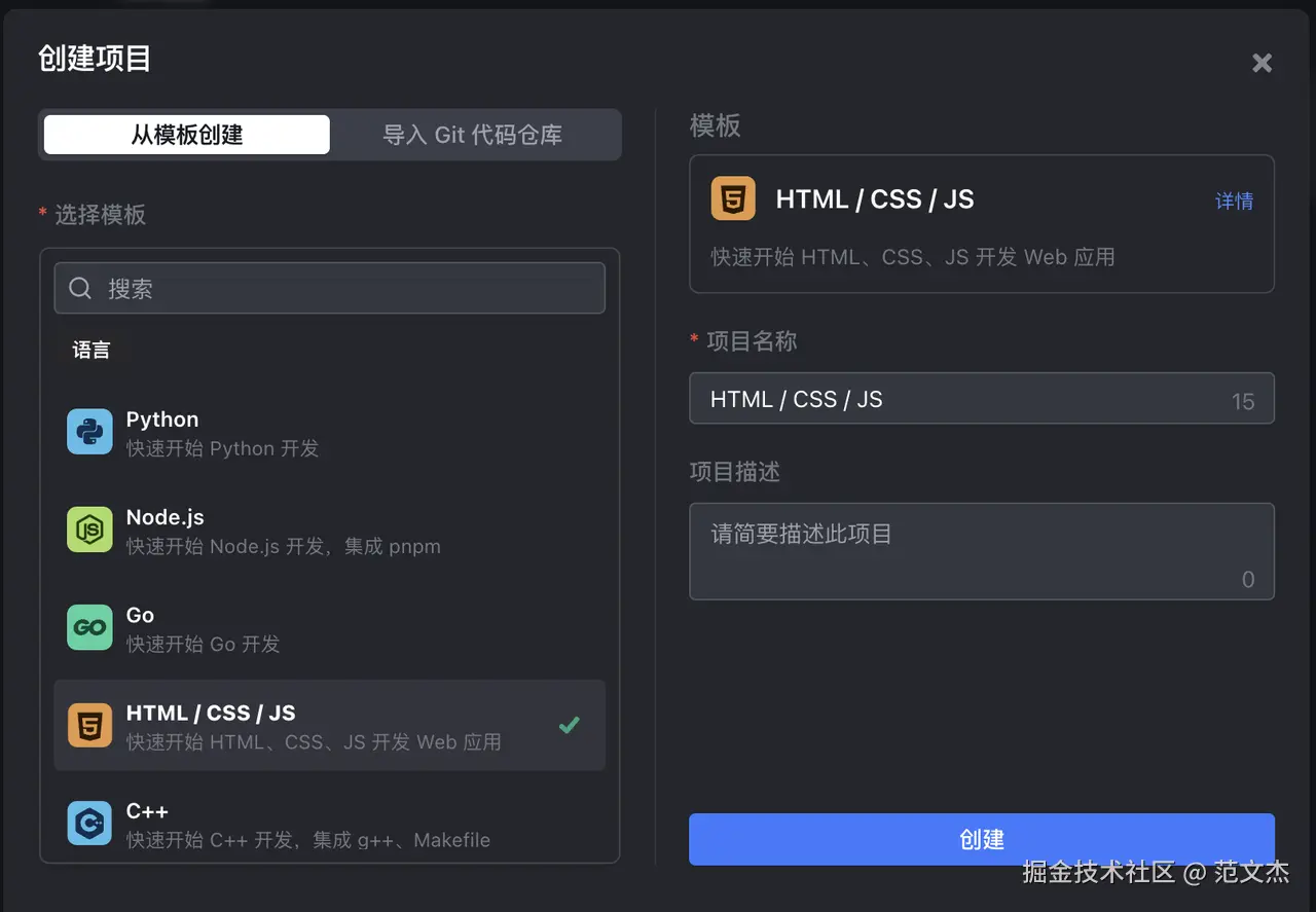 不过,Web IDE 目前还不支持导入本地项目,首次进入需要创建新项目或导入 git 项目,出于教学目的,此处推荐创建一个 HTML/CSS/JS 模板项目: