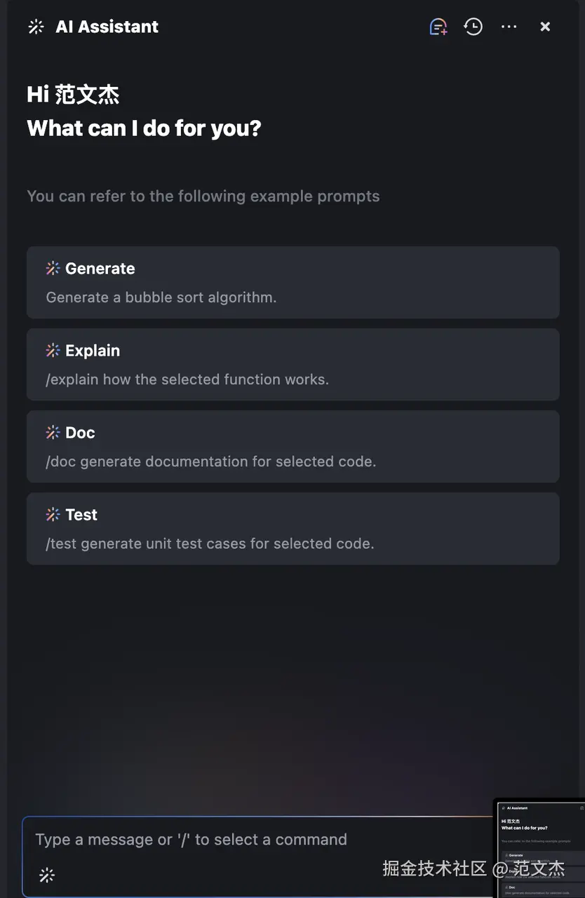 - AI Assistant 是主要交互入口,在这里可以问各种问题,整体交互上与 VS Code 相似,也包含 generate、test 等能力