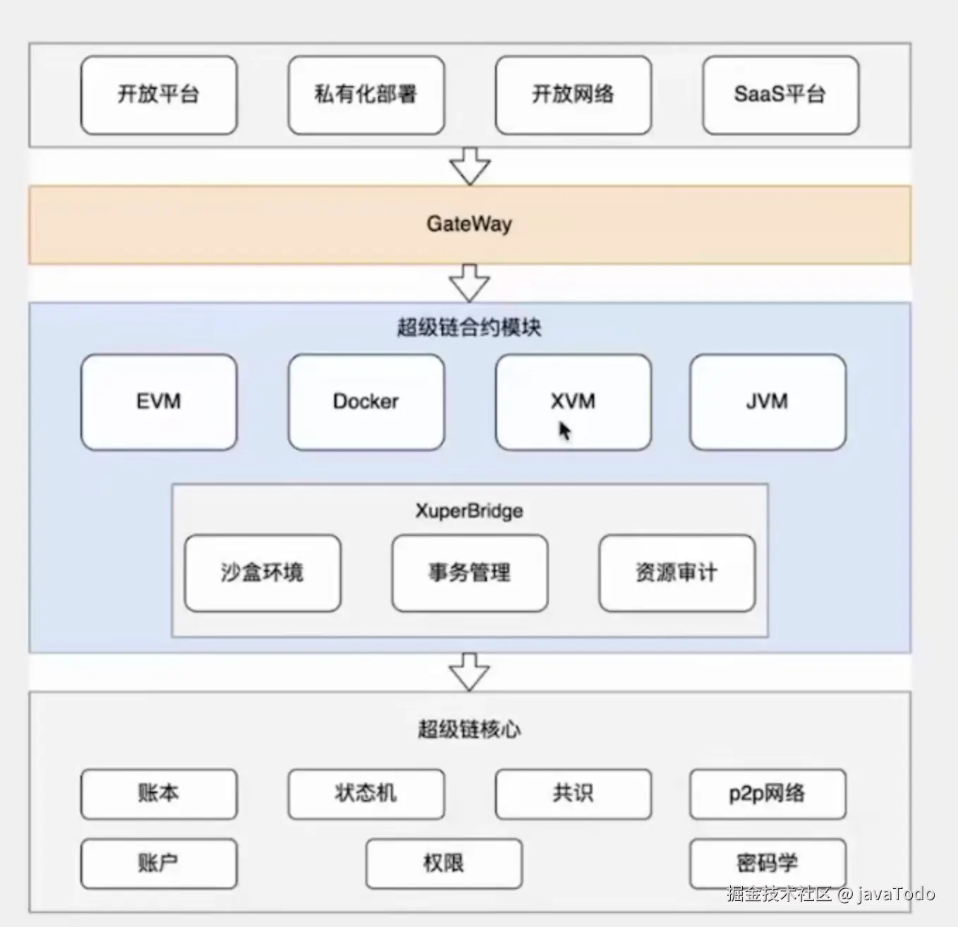核心数据和核心业务逻辑运行在区块链上,保证去中心化与上层业务系统进行衔接,提供用户界面或业务集成: