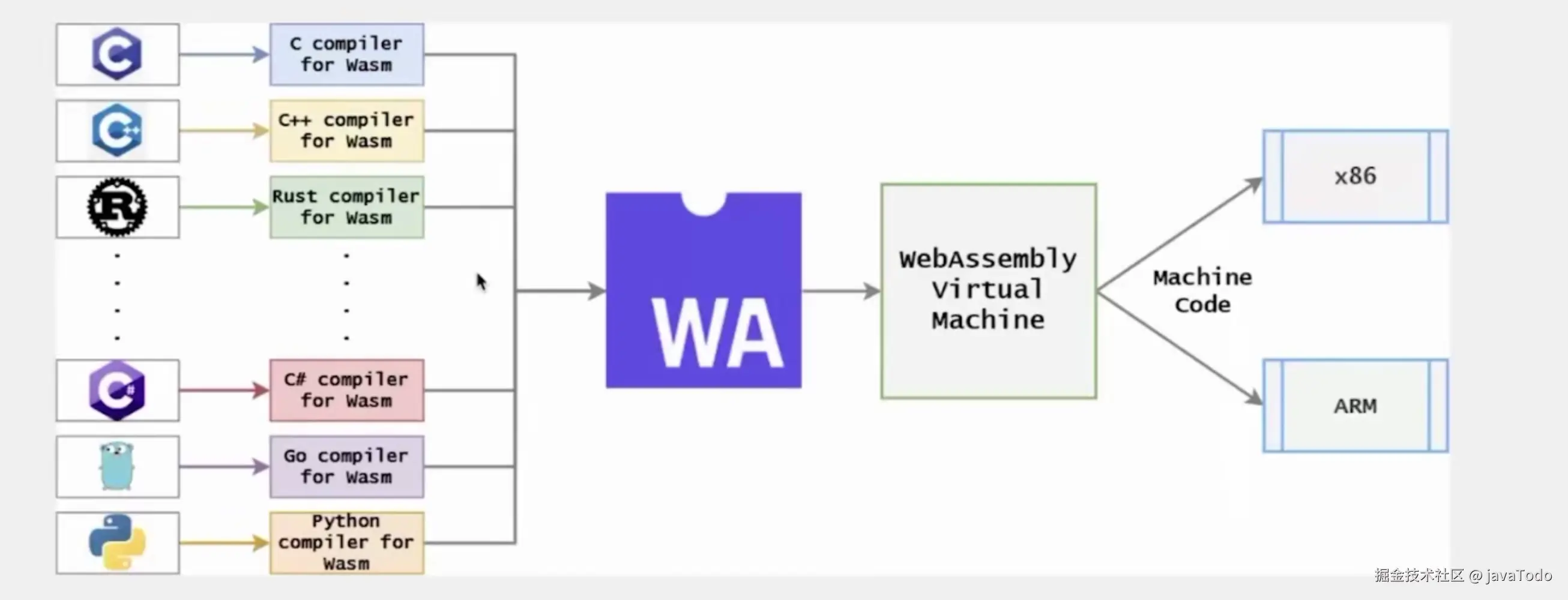 将智能合约编译成WebAssembly字节码格式,以便在区块链环境中高效、安全地执行。WASM(WebAssembly)是一种高效、可移植的低级字节码格式,最初是为在浏览器中高效运行而设计的,但由于其安全性、跨平台兼容性和高效性,逐渐在区块链和智能合约领域中获得广泛应用。