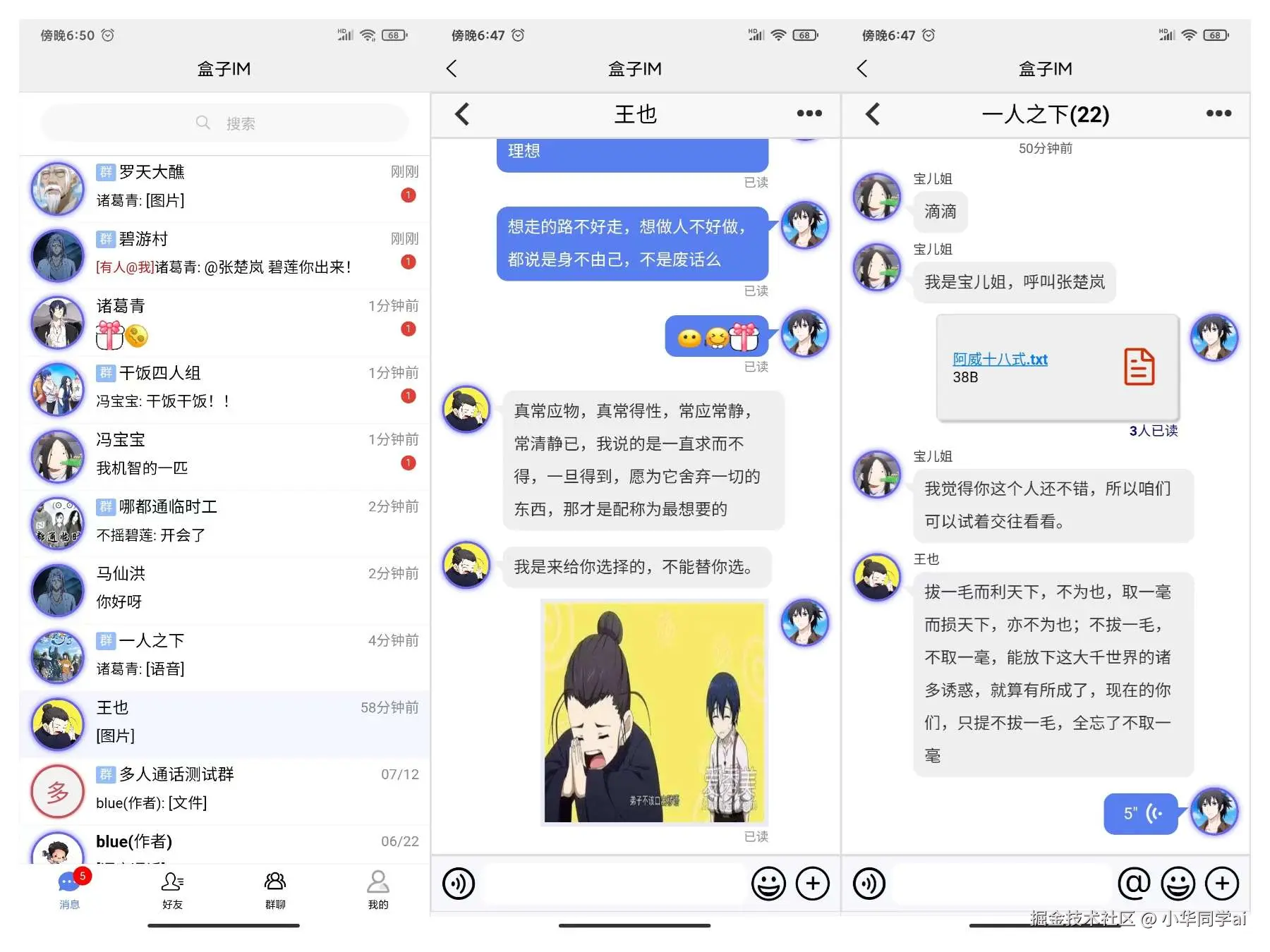 盒子IM后端采用springboot+netty实现,web端使用vue,移动端使用uniapp,可以运行在多个平台上。