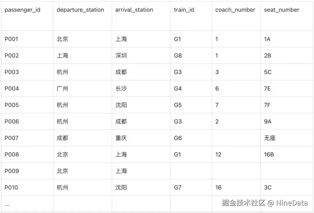 每列火车允许发售10%的无座票,无座的乘客coach_number为空,seat_number=无座。