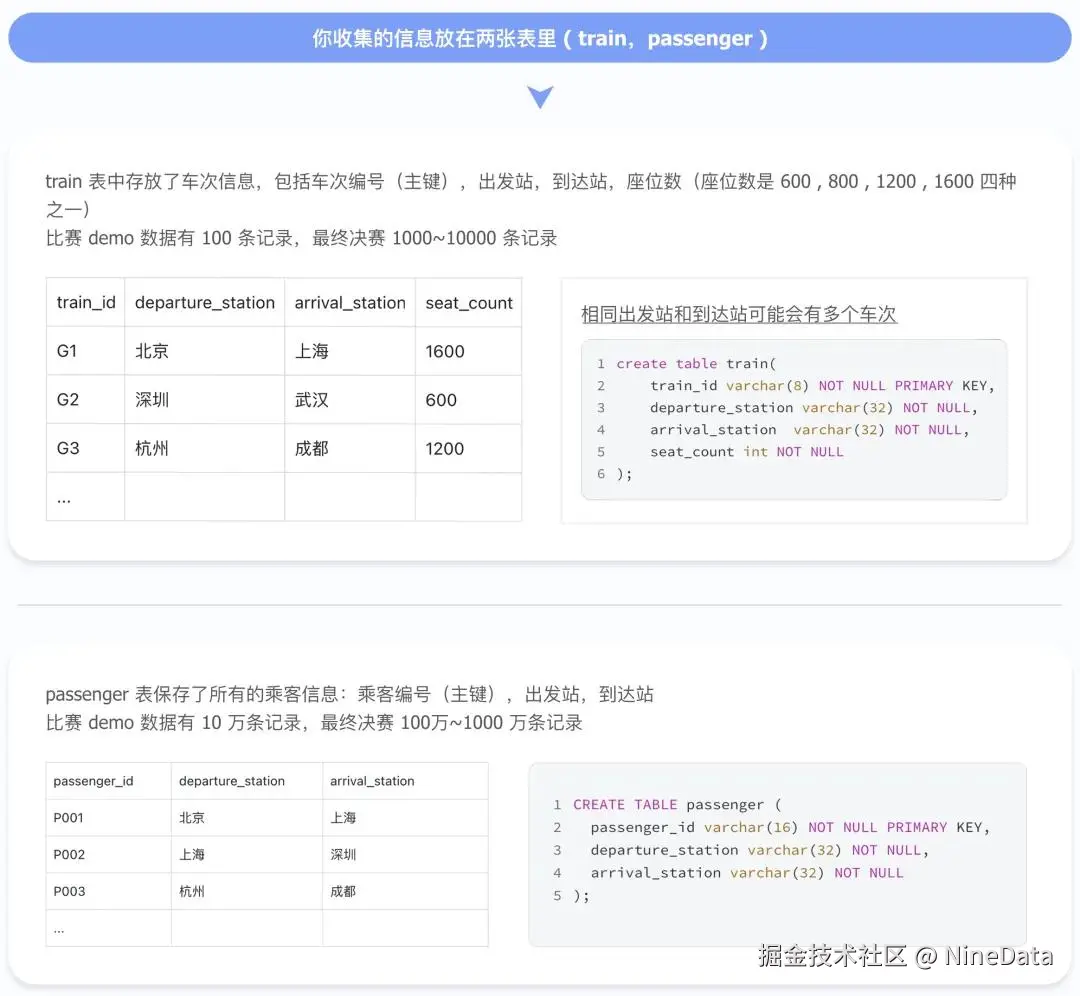 - 表 passenger 在初赛中有 10 万条记录,决赛 100万~1000万 条记录。