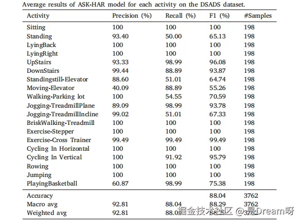 在DSADS数据集上,ASK-HAR模型的准确率为89.42%,F1分数为89.42%。模型在多个活动上取得了完美的精确率、召回率和F1分数,如“Sitting”、“LyingBack”、“LyingRight”、“BriskWalking-Treadmill”和“Exercise-Stepper”。但对于“Moving-Elevator”和“PlayingBasketball”活动,模型的F1分数较低,分别为55.26%和75.38%。