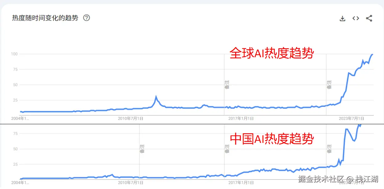 可以看到转换点就在2022年,那时chatgpt引发了全球性AI变革。诚然中国和世界其它国家一样对AI的投入都非常早,只是一直没有被引爆。而chatgpt就是点燃全球AI风暴的导火线。2022年11月30日chatgpt发布,3个多月后中国百度紧跟着发布了百度文心一言,同时国内政府或各行各业都积极投入到AI技术发展。
