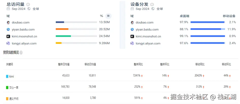 一些统计网站上也能看到国内的AI产品访问量在增加,之前有看到一篇文章说kimi月增长率高达1000+%,全球增速榜中排名第一。当然这些数据有推广、宣传的意味在里面,真假暂且不论,但也能表现出国内的生成式AI产品的发展势头正旺。