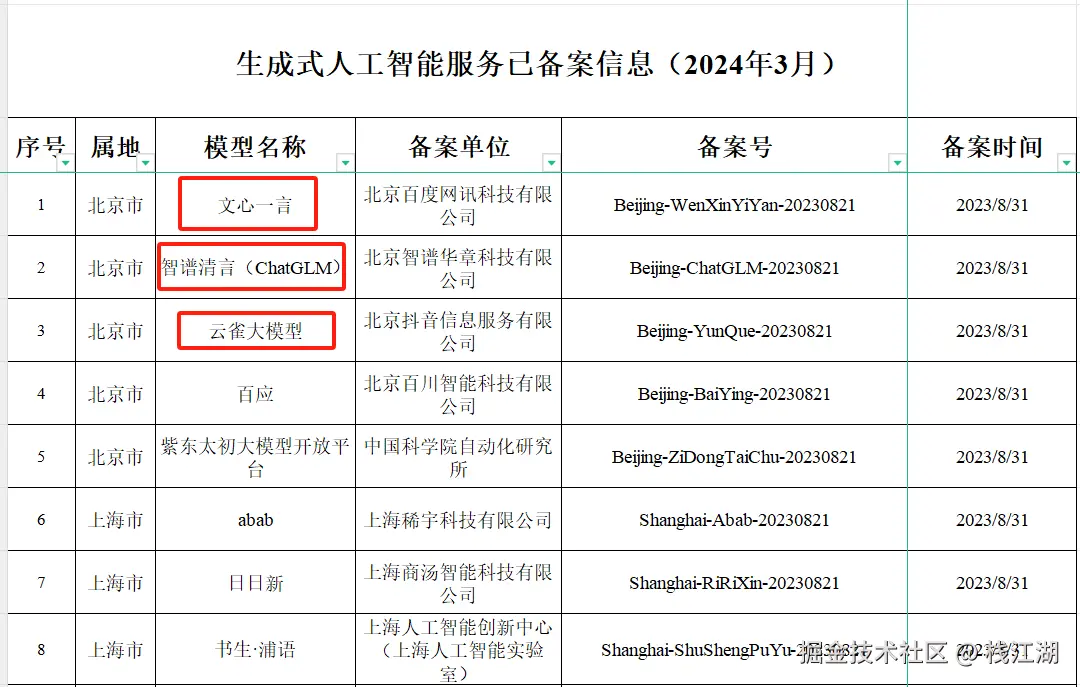 像百度文心一言、清华智谱清言、字节的云雀大模型等等都在备案名录中。