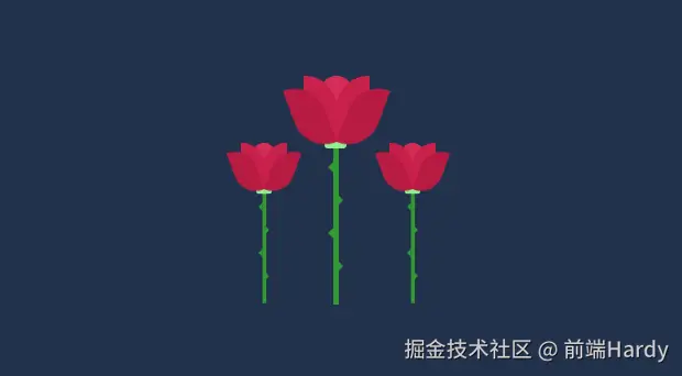 - .flower .rod .spike 设置花杆上的刺。border-color: transparent #329932 transparent transparent; 设置边框颜色,形成三角形的刺。