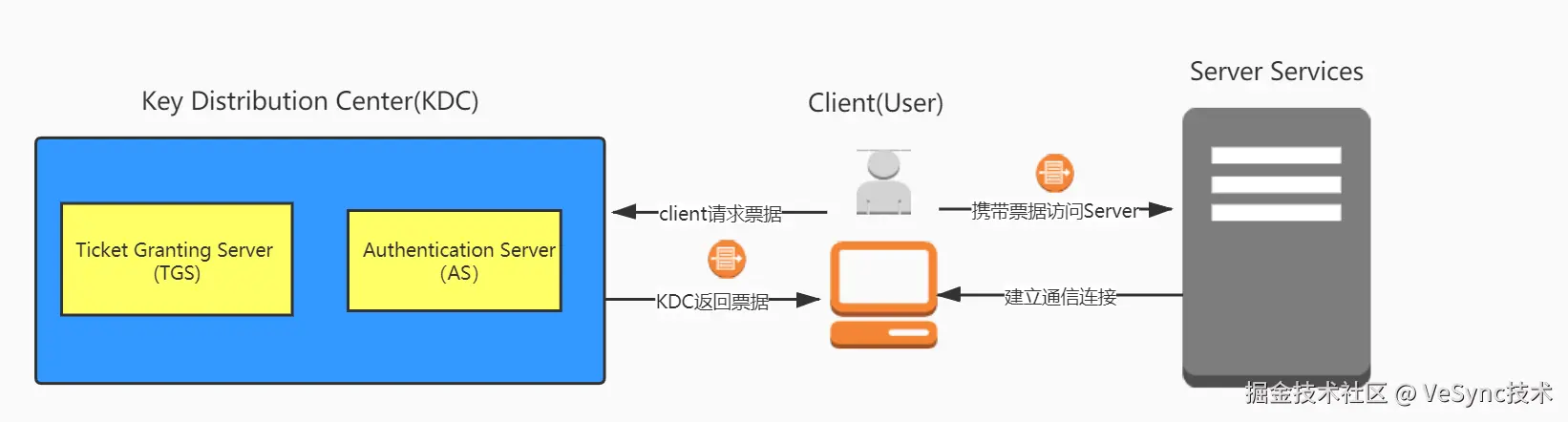 原理:Kerberos使用基于票据的认证机制,用户通过KDC(Key Distribution Center)获取票据后才能访问资源,如图所示: