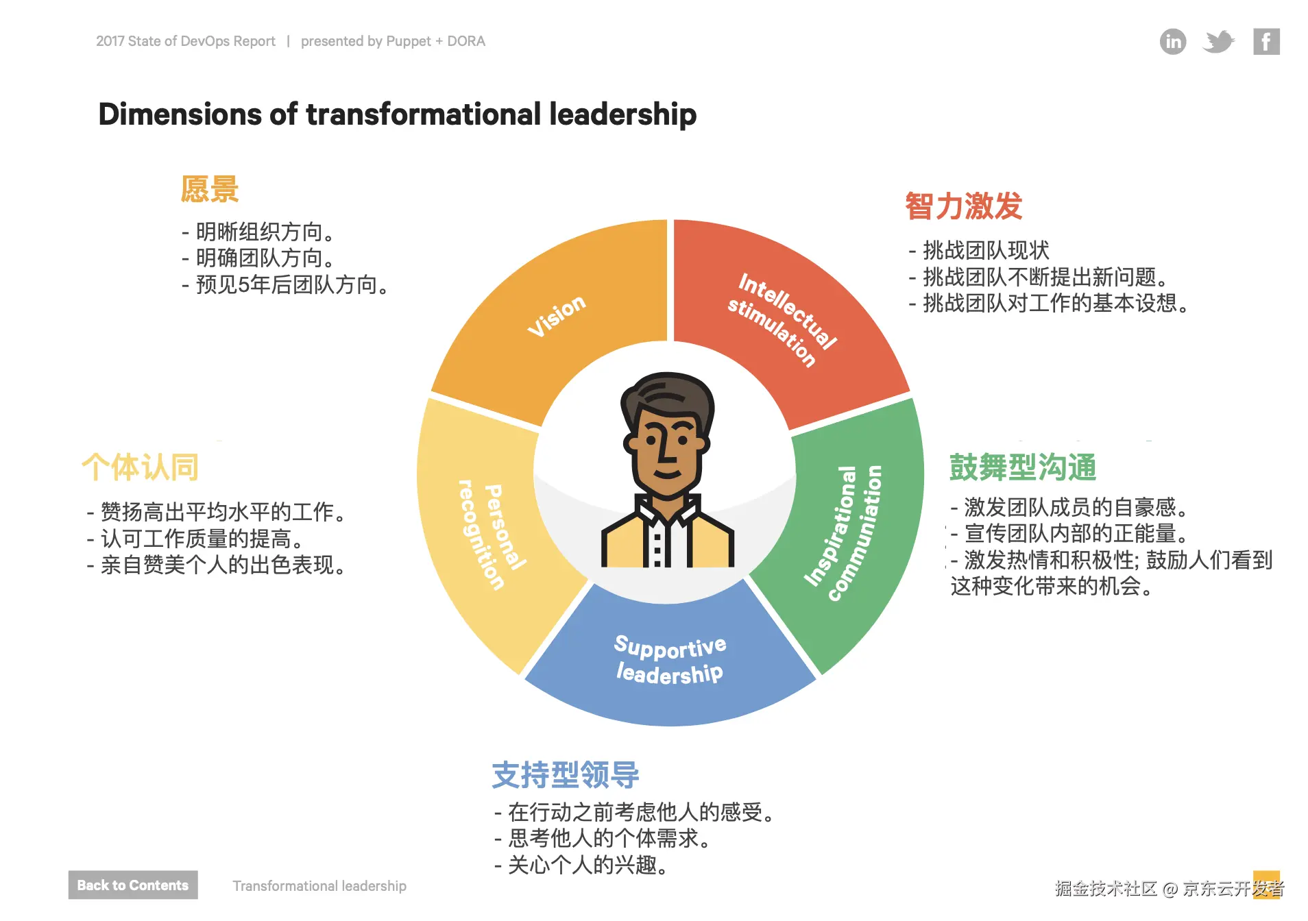 在2017年的报告中,提出了变革领导力的概念。所谓变革领导力,是指领导者通过调动员工的价值观和使命感,来激发和鼓励追随者达成更好的效能,并促进广泛的组织变革。其实对于技术管理者而言,他们身兼技术实践和管理实践,除了以服务者的心态为一线员工提供良好支持的同时,还应该鼓励思考目标感,鼓励创新,并建立失败宽容的环境。