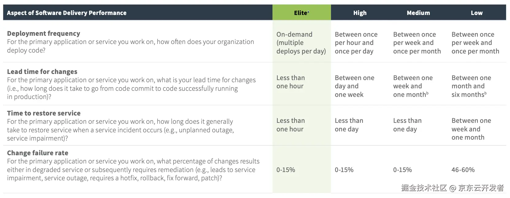 从效率和质量维度提出2组4个核心结果指标衡量公司软件交付水平,并且根据业界大量样品调研定义出精英、高中低四个级别,可以作为行业对标参考线。(按此标准京东大致处于中高效能之间的水平)
