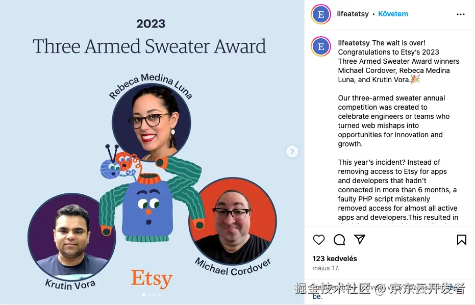 三只袖子的毛衣,代表了Etsy对于错误的态度。因为每年公司年终总结大会上都会颁发各种奖项,其中的一个奖项的奖品就是三只袖子的毛衣。获奖者是公司年度引入最大问题的个人,因为在他们看来,犯错误并不是什么大不了的事情。错误本身并不是个人的问题,而是公司系统和制度的问题,正因为有了这样的错误,才给了公司改进和成长的空间,从某种意义上说,这也是一种贡献。 一直以来我都以为这是个段子而已,结果这两天Google了一下才发现在2023年他们居然还在颁发这个“三只袖子的毛衣”奖,不仅如此还有人实名上榜,看起来都满开心的样子,所以说到底文化的事情开始都是笑话,但当你一直做一直做,人们才会相信你是玩真的,也会逐渐接受或者拥抱这样的文化,只不过,我们有多少时间等待改变发生,就是另外一个问题了。