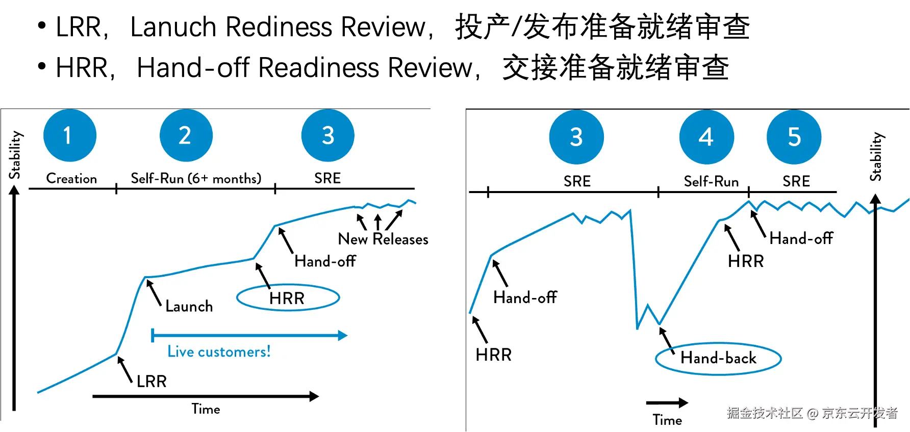 协作是DevOps文化的根基,旨在打破孤岛和筒仓,通过职责共享和团队自治实现快速交付,最典型的代表就是亚马逊所倡导的“You build it,You run it”文化,通过研发自运维的方式来打破对于运维团队的依赖,同时将精力聚焦于打造高效的运维服务能力上(你可以依赖我的平台,但是不能依赖我的人)。无独有偶,在Google的SRE工作模式中,同样提倡有质量的hand-off和hand-back机制,其核心在于我们应该避免让职责转移变成协作的目的,或者用更加通俗的话来说,协作的目的不是甩锅,或者丢炸弹,而是站在全局流程最优的视角,来做合理化的资源分配和分工而已。