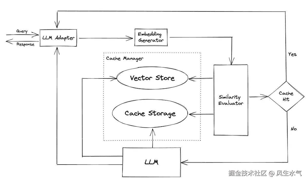 当请求来临时,会先经过LLM Adapter模块,通过该模块屏蔽底层LLM的差异,对外提供统一的接口。请求会继续被Emebdding生成模块处理,将请求处理成嵌入向量。然后,通过simlarity evaluator来计算当前问题和已经缓存问题的相似度,判断是否该问题已经被缓存过。如果已经被缓存过,则命中cache, 直接从cache storage中返回结果。否则,没有命中,则由LLM生成答案,并在返回结果时将当前请求和答案缓存起来,以便下次查询时使用。