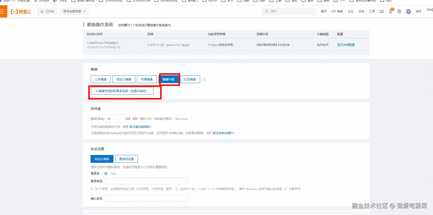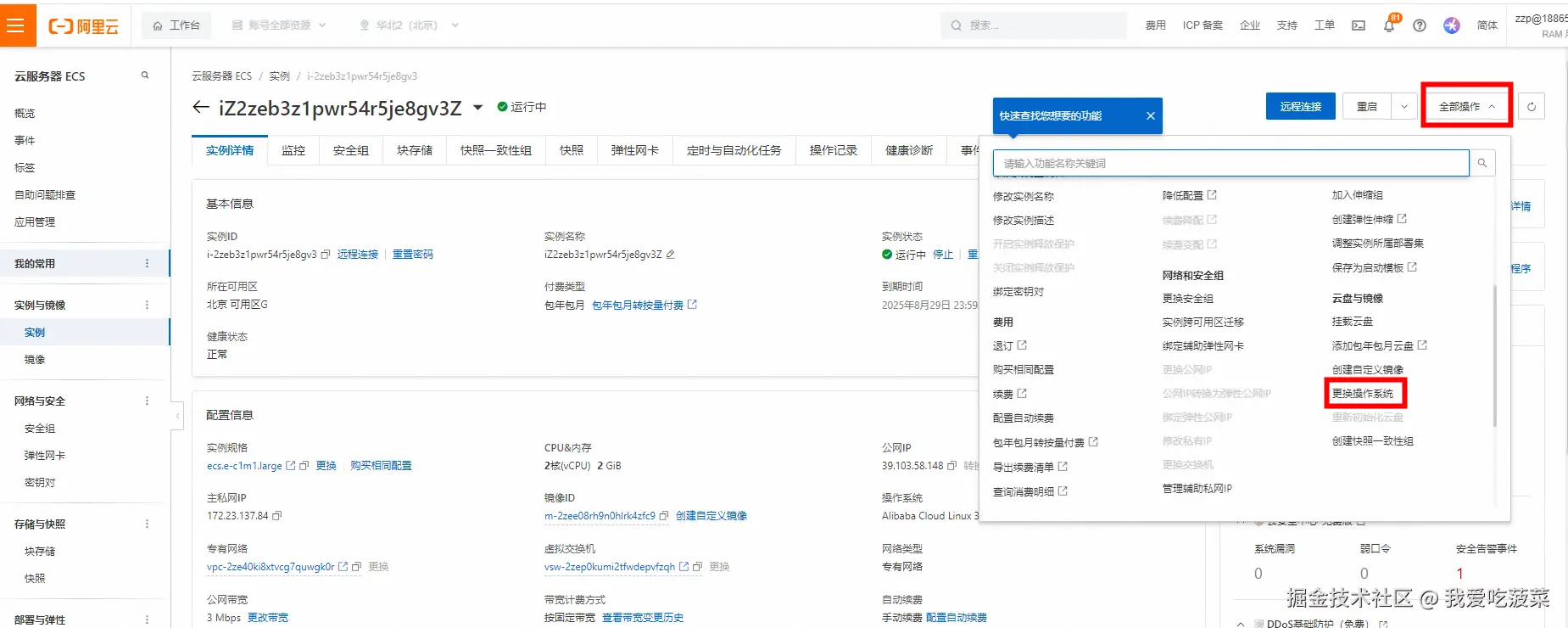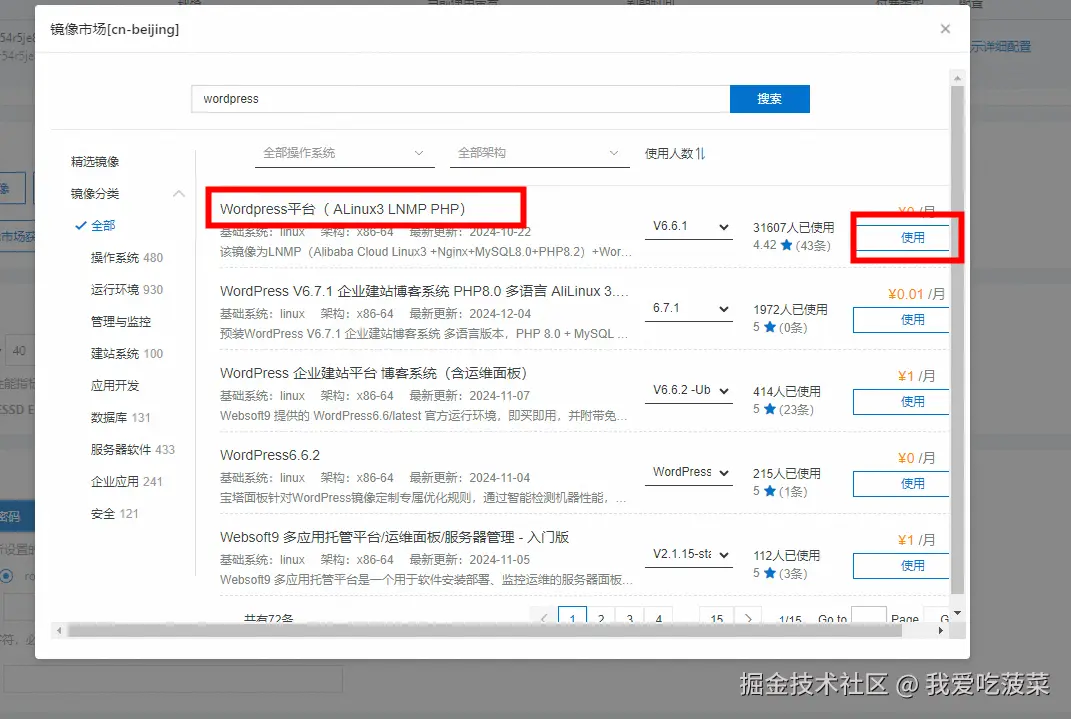 紧接着,我们利用wordpress搭建自己的博客,可以选择阿里云镜像云市场中的wordpress镜像搭建。我们在ecs实例上更换操作系统,选择镜像市场上的wordpress镜像。这里就选择用的人多的,免费的镜像就行,我用的Wordpress平台( ALinux3 LNMP PHP)镜像。选择完系统镜像后,稍等几分钟后ecs重启后就可以了。