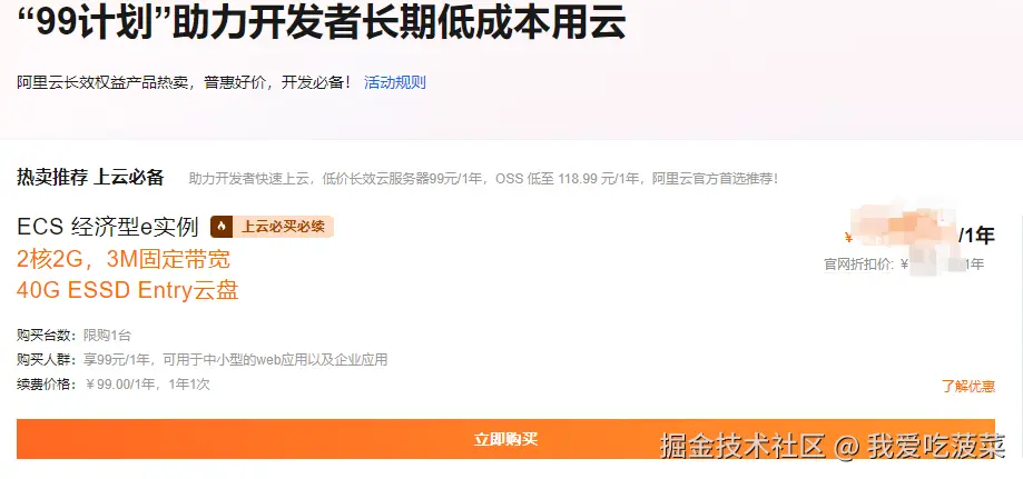 首先我们打开阿里云官网,阿里云有一个“99计划”,双11做活动,一台基础的ecs服务器(2C2G3M)只需要79元,这个配置基本满足个人博客的需求了。而且我主推阿里云服务器,其它厂家的服务器我也用了,感觉没有阿里云好用,且有些配置是虚标,最重要的一点,阿里云来年续费也只要99元。