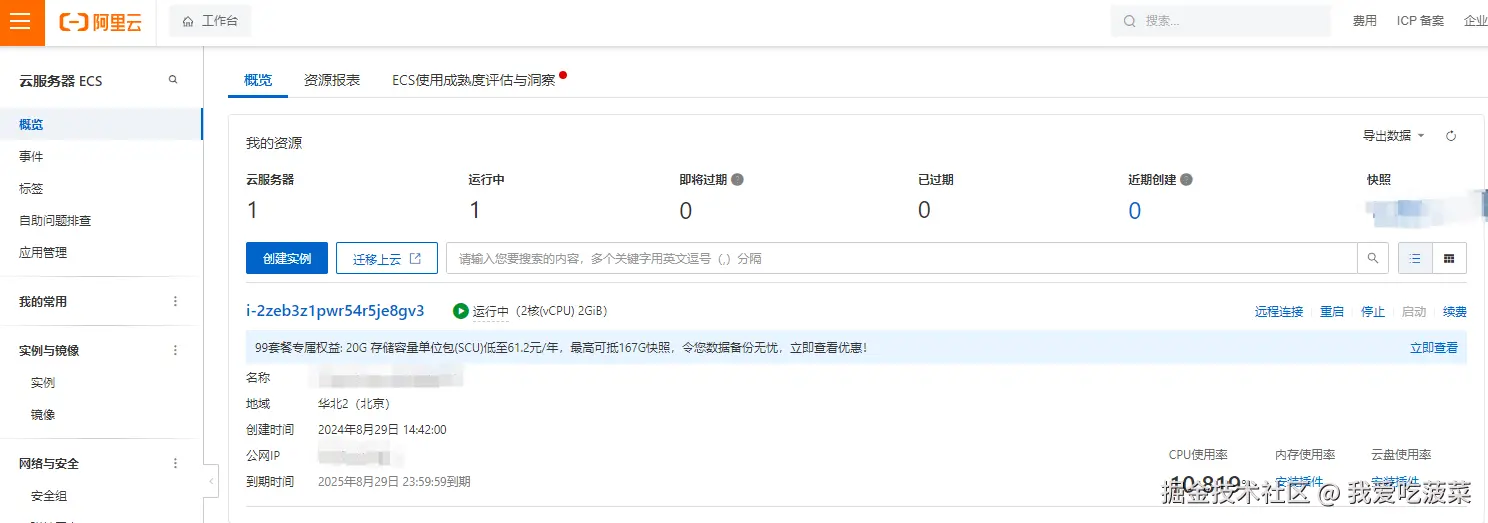 购买完成后,前往阿里云工作台就可以看到自己买的ecs服务器了。
