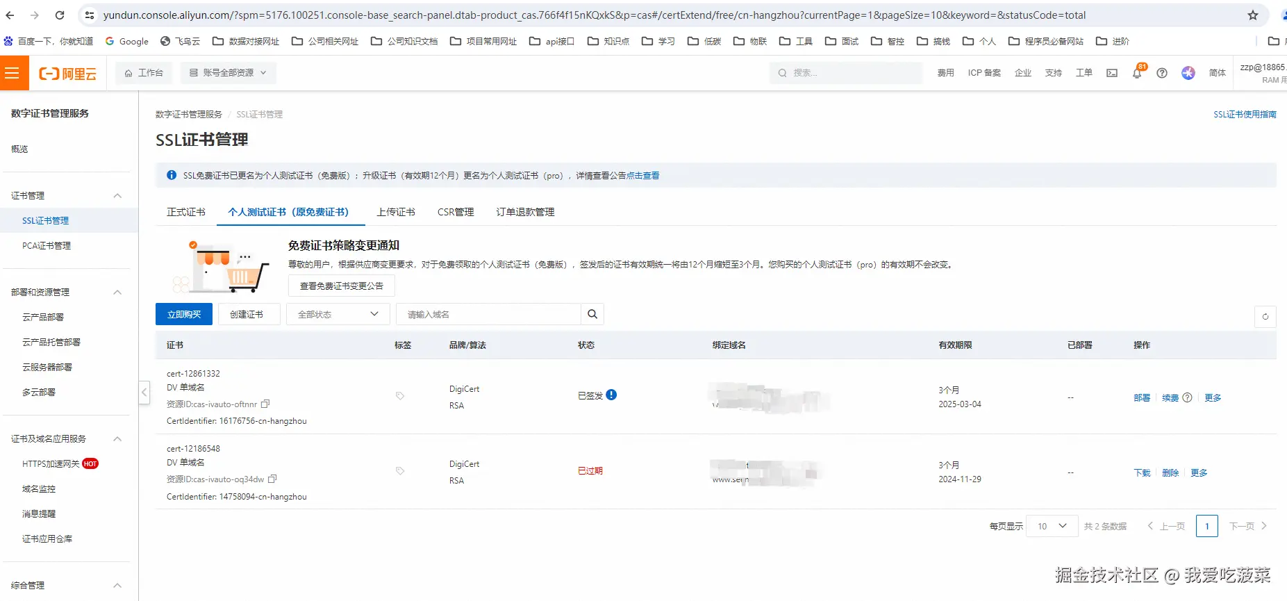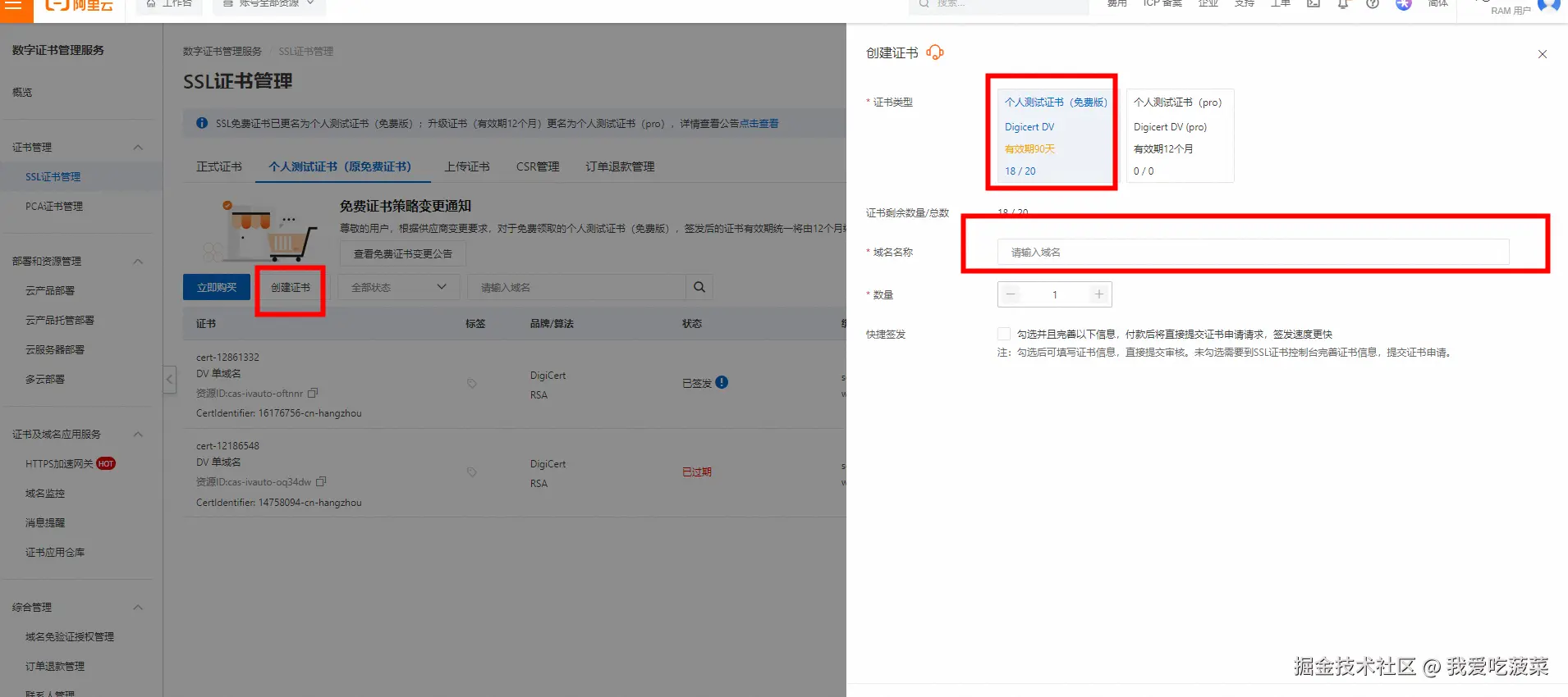 如果想要https访问博客的话,需要配置ssl证书并部署。 登录阿里云工作台ssl证书管理,这里可以免费领取20个个人测试证书,每个证书有效期3个月。个人证书麻烦的一点是,需要每三个月更新一下,如果买正式证书的话就不用,但是花钱。点击创建免费的个人测试证书,申请完后,下载根据部署形式,下载相应的证书文件。