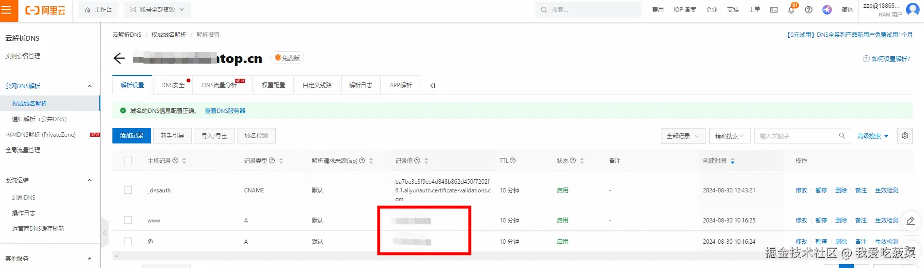 备案完域名之后,添加域名公网DNS解析,IP为你的服务器公网IP。在浏览器中输入域名,如果能访问到刚才上面的博客,说明DNS配置没什么问题。