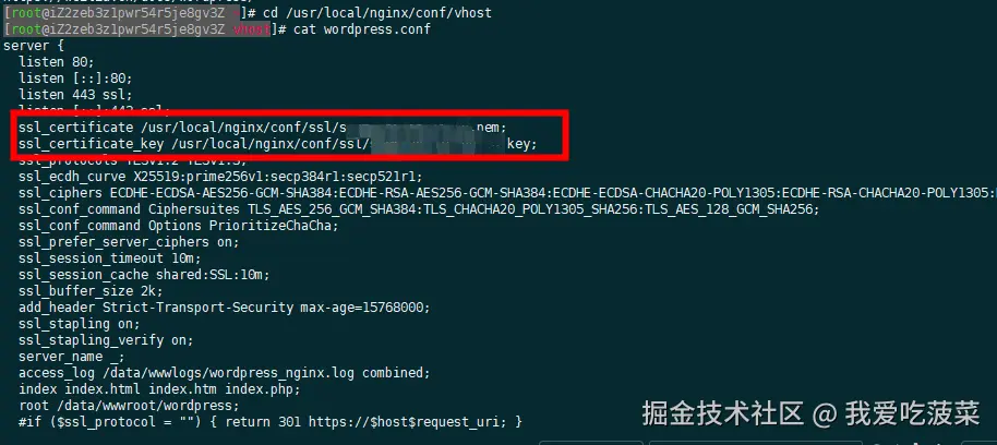 但是我们用的wordpress镜像不一样,是修改/usr/local/nginx/conf/vhost/wordpress.conf 。将刚才下载的本地ssl证书上传到服务器某一个目录,修改/usr/local/nginx/conf/vhost/wordpress.conf中下述的证书为实际的路径并保存,浏览器上输入https域名没有不安全提示说明配置成功。