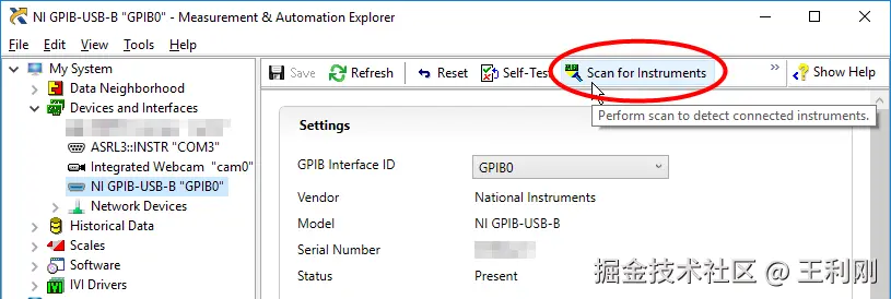 - 确保你在 NI 工具中配置的 GPIB 地址与仪器上的地址匹配。如果地址不正确,扫描时无法发现设备。
