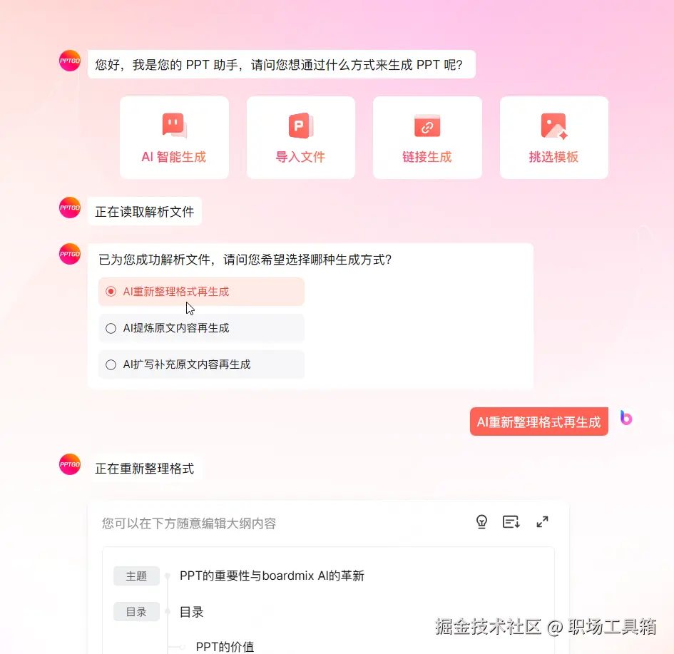 - 链接生成PPT:粘贴文档/文章链接,经解析后自动生成PPT