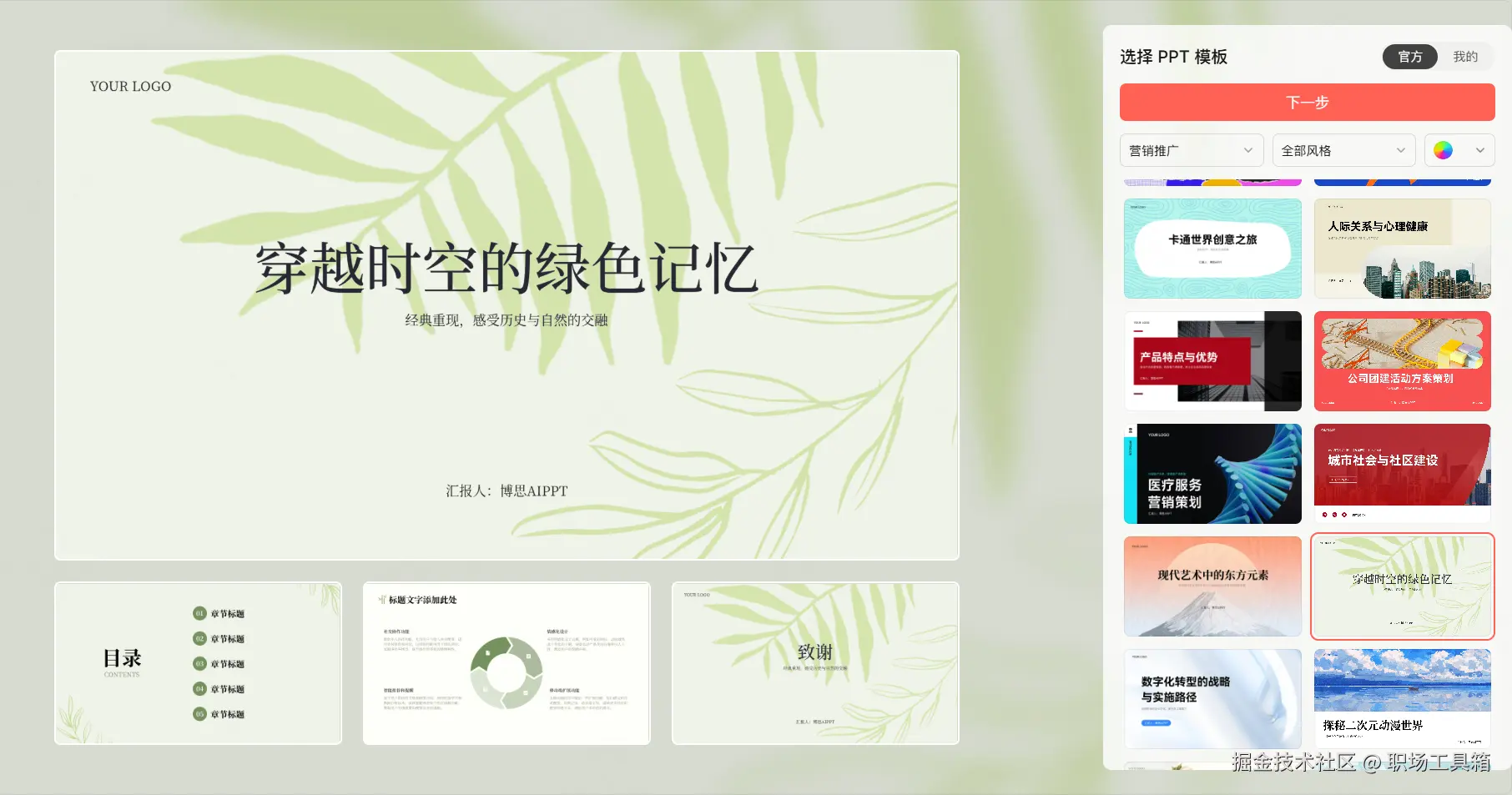 博思AIPPT预置了上百款高品质、适用于不同场景的PPT模板,如果觉得模板数量太多,可点击右侧的标签,通过使用场景和风格来组合筛选,更快找到所需的PPT模板。确定好PPT模板后,点击右上角的“下一步”,AI就会生成一份完整的高颜值PPT,让你轻松完成PPT制作!