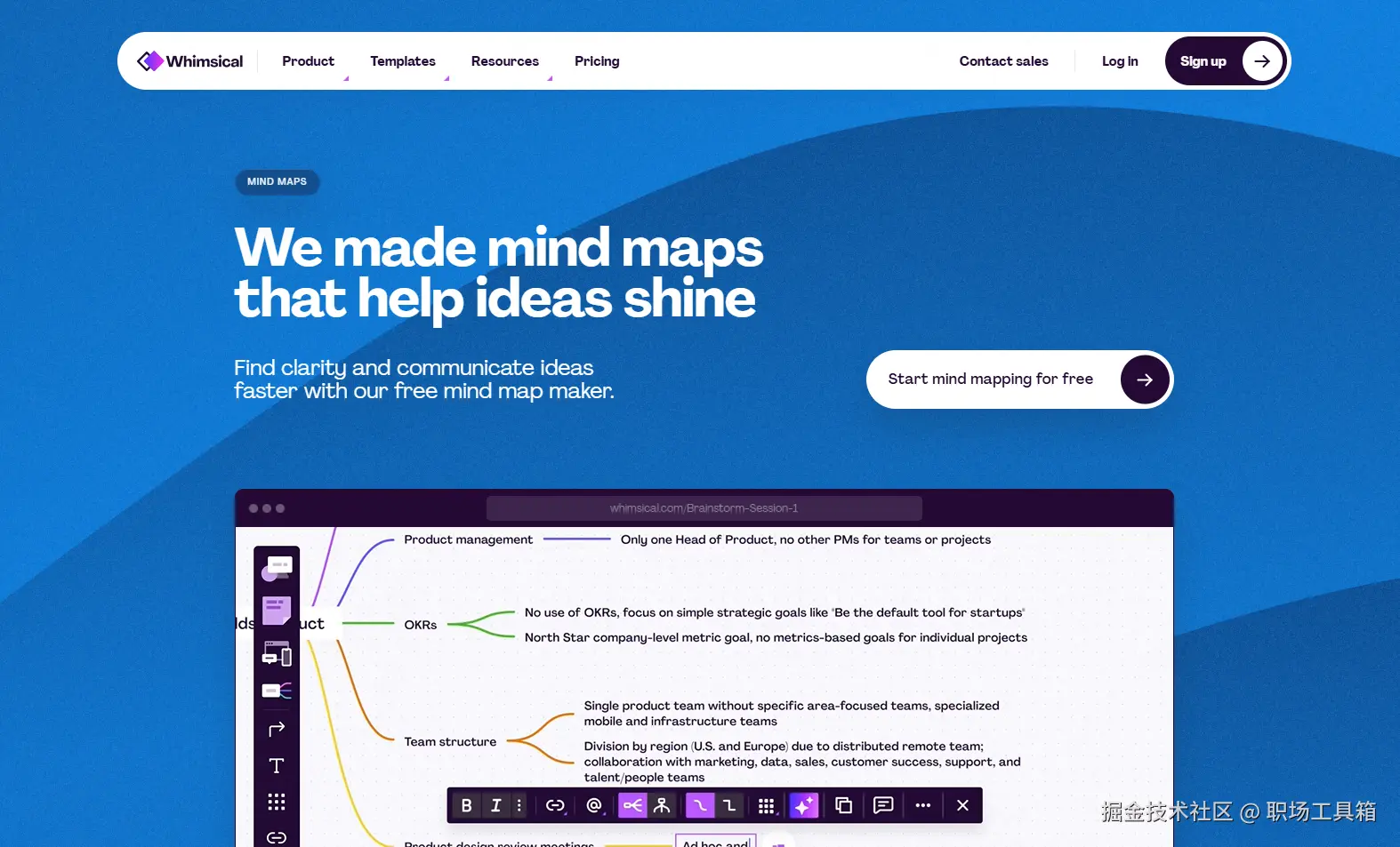 Whimsical是一款集成AI功能的智能思维导图工具,它完美结合了传统思维导图的结构化呈现方式与AI的智能化分析能力,只需输入一个导图主题,就会快速生成一份对应的思维导图。
