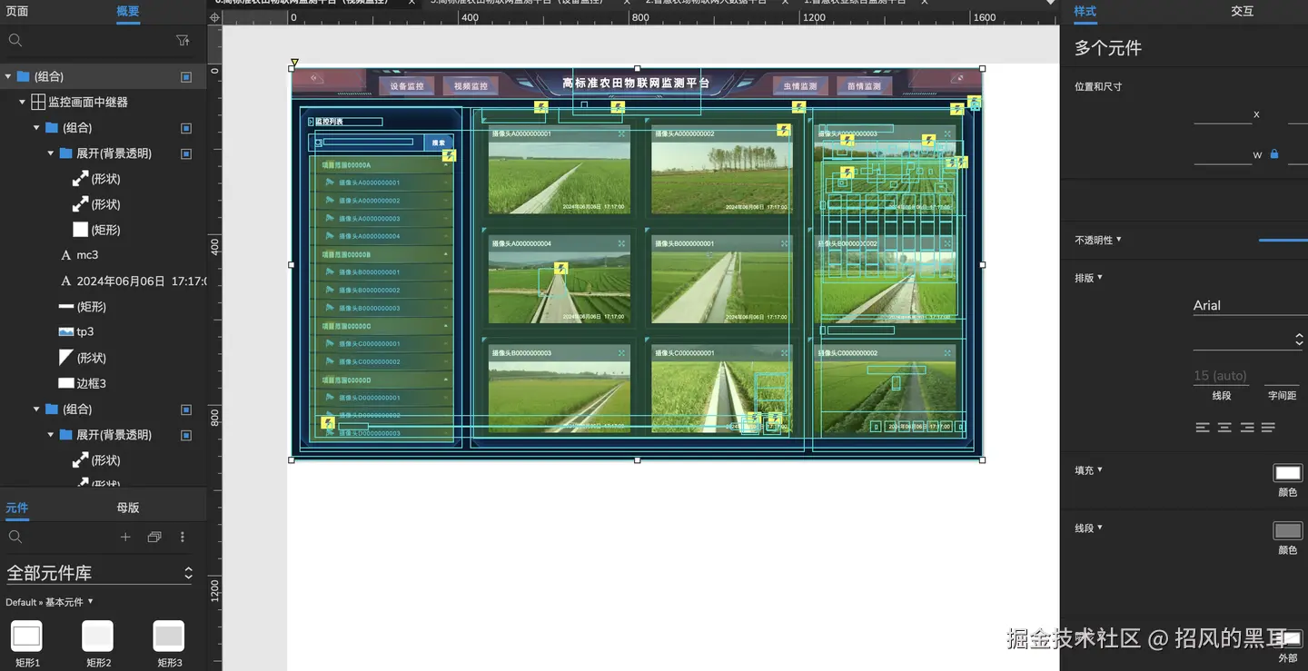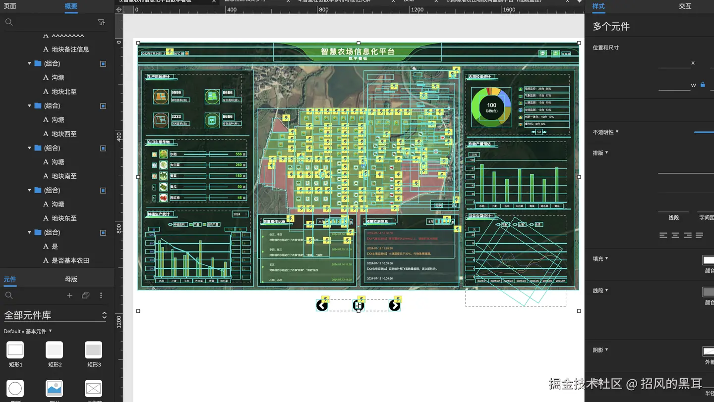 Axure RP提供了丰富的界面设计元素和组件库,设计师可以根据实际需求选择合适的元素和组件,快速构建出美观、实用的界面。在智慧农场可视化大屏系统的设计中,设计师可以利用Axure RP的界面设计功能,创建出包含地图、图表、表格、按钮等多种元素的界面,实现数据的直观展示和交互操作。