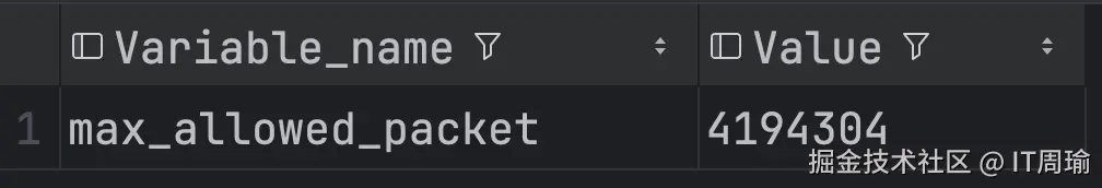 从错误信息可以看出,报错原因并不是in的数据太多了(已经有一百万个了),而是sql语句太长了,超过了4,194,304个字节,也就是4M,在我的MySQL中max_allowed_packet变量的值为