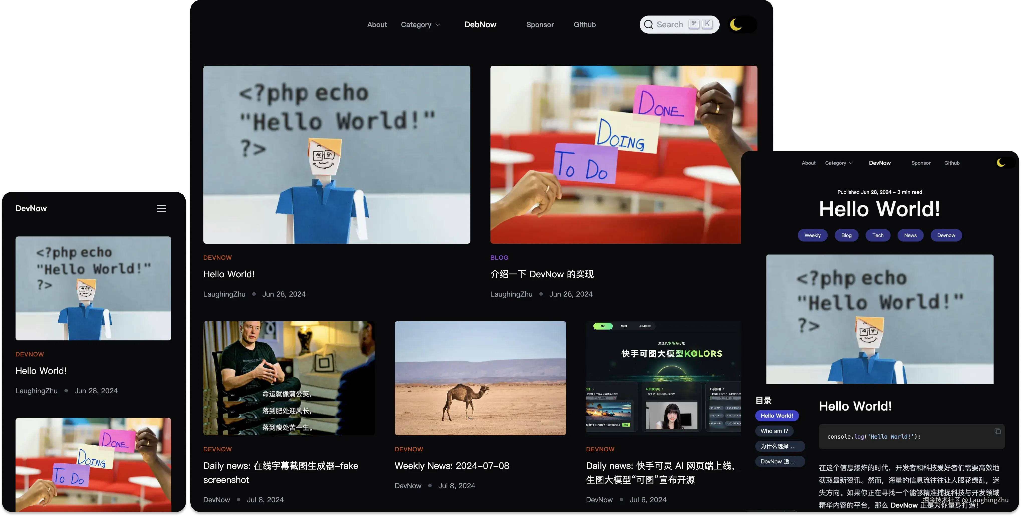 DevNow 是一个精简的开源技术博客项目模版,支持 Vercel 一键部署,支持评论、搜索等功能,欢迎大家体验。同时也支持 Follow、 RSS 订阅,欢迎大家订阅。
