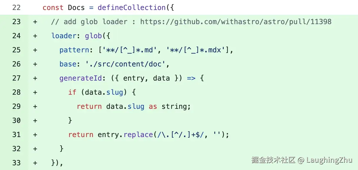 Content Layer loader,然后在loader中进行处理: 通过自定义generateId来实现自定义 id。解决方案是在社区找到的 feat: add glob loader