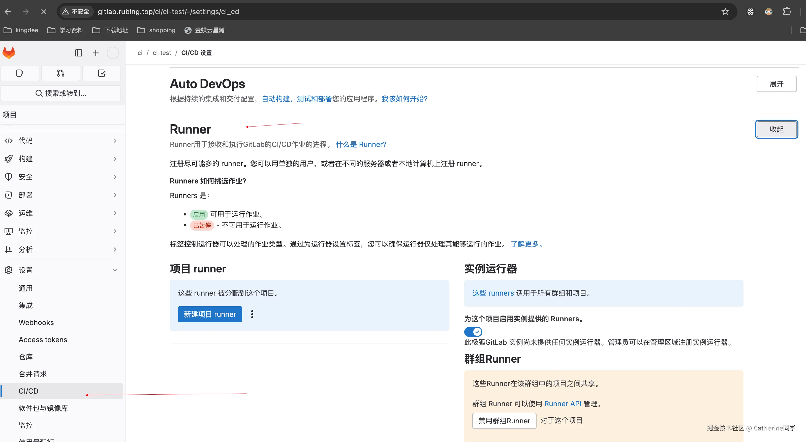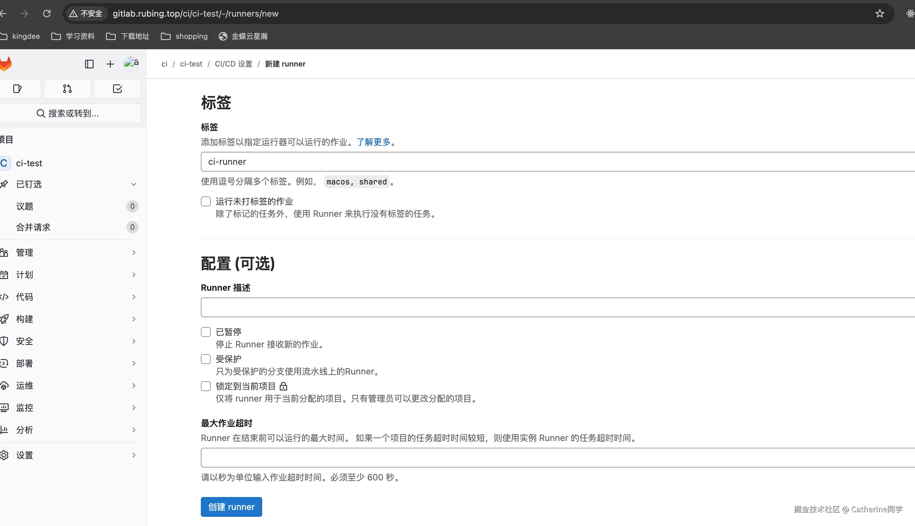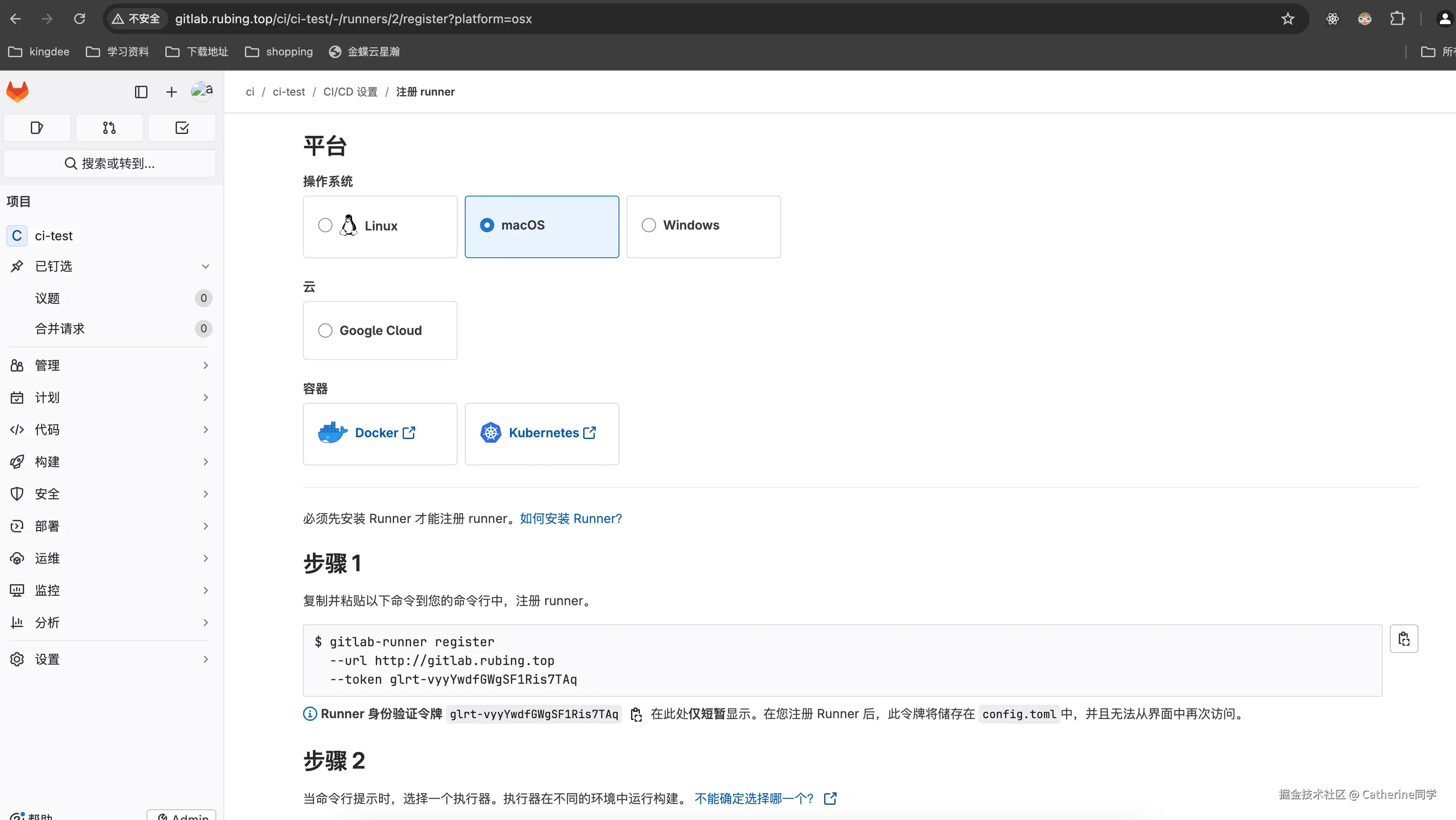 // 先拉取gitlab-runner 镜像 docker pull gitlab-runner// 新建gitlab-runner 容器并进入容器注册runnerdocker exec gitlab-runner gitlab-runner register -n \--url http://gitlab.rubing.top/ \--registration-token glrt-CCNzJPfyBgzinYxpg4aA \--tag-list ci-runner \--executor docker \--docker-image docker \--docker-volumes /var/run/docker.sock:/var/run/docker.sock \--description "ci-runner"