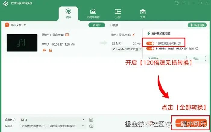 步骤3:设置完目标格式后,开启高速转换下的【120倍速无损转换】按钮,再点击【全部转换】即可。