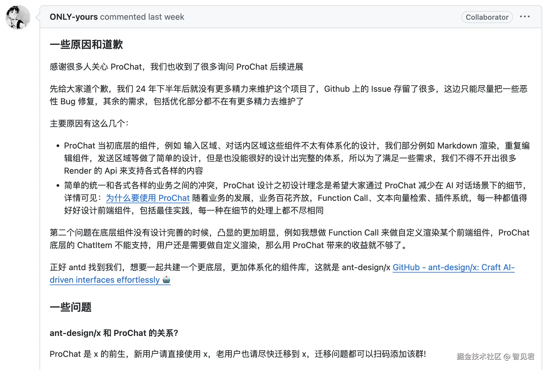 不知道有没有小伙伴们使用过 ProChat,这个库后面的维护可能会有些不确定性,其维护者表示 “24 年下半年后就没有更多精力来维护这个项目了,Github 上的 Issue 存留了很多,这边只能尽量把一些恶性 Bug 修复”