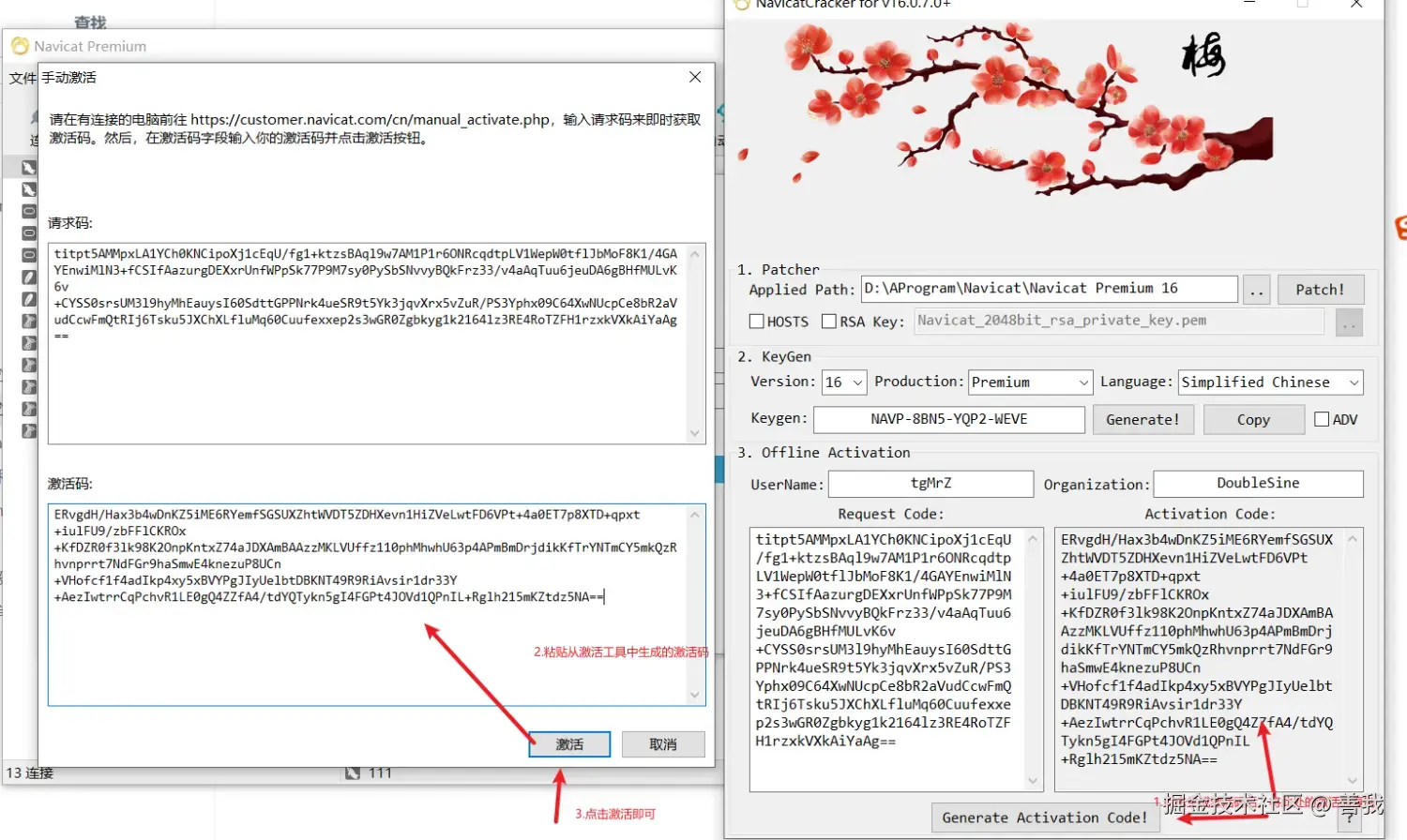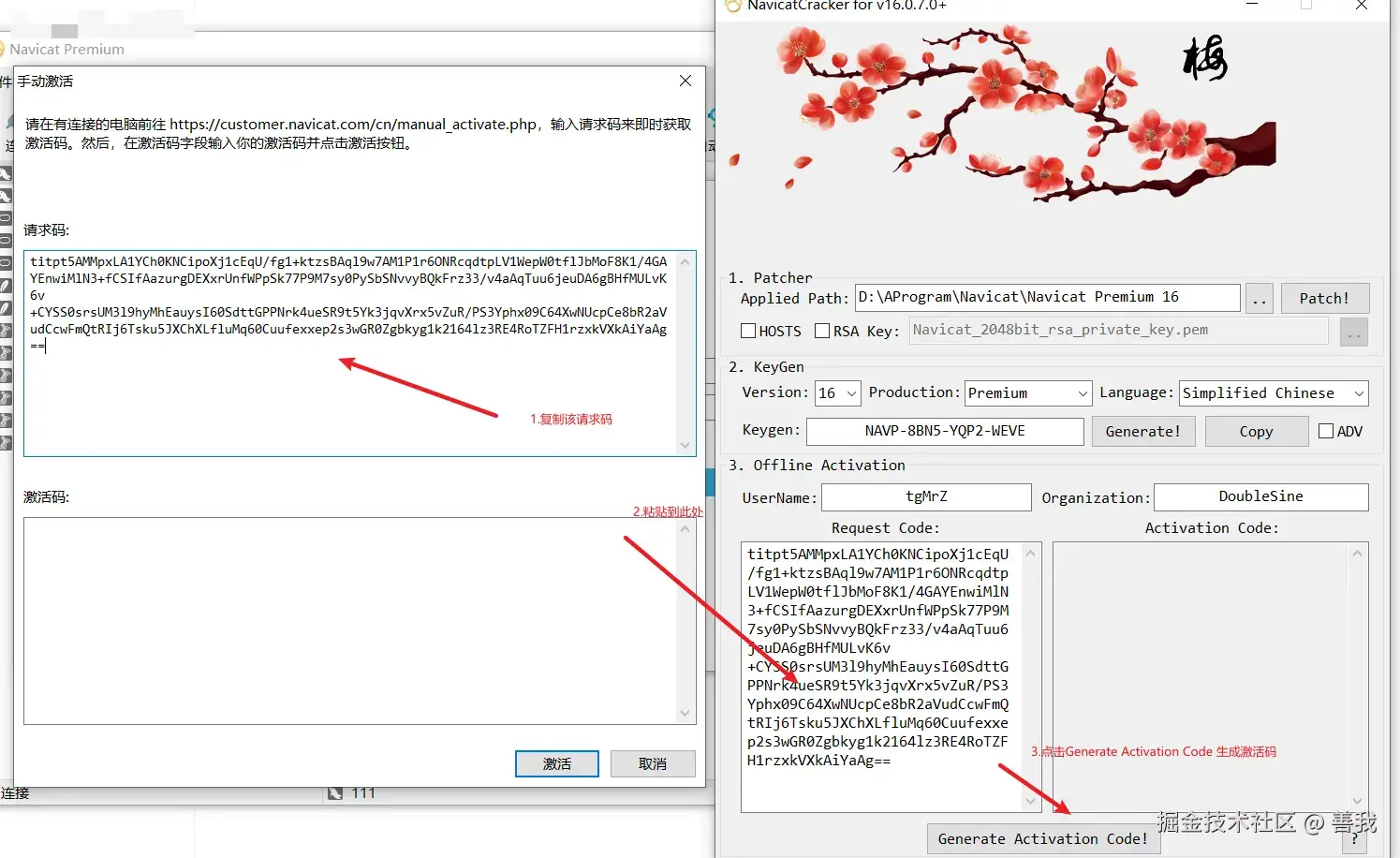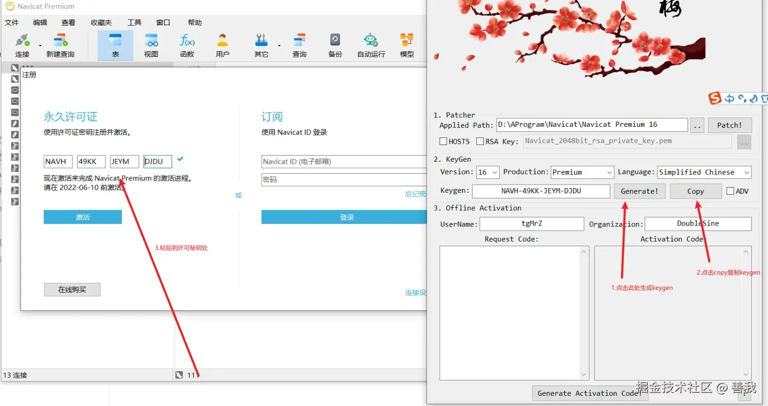 7.打开navicat的注册页面,打开激活工具,点击Generate生成Keygen,点击Copy,粘贴到navicat注册页面中!点击激活