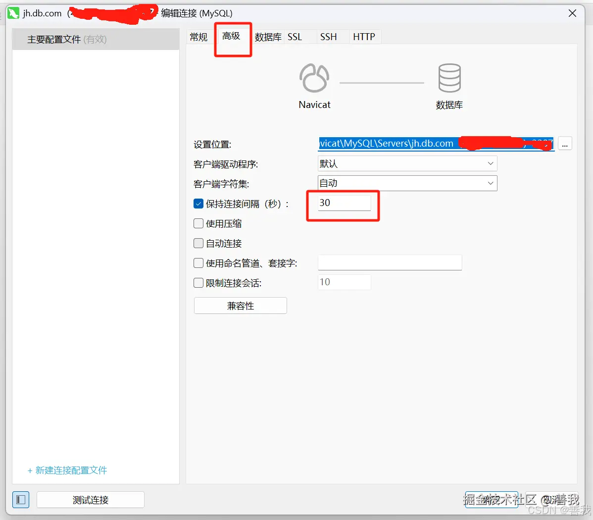 - Navicat 客户端有一个设置:保持连接间隔,默认是 240 秒,意思是,客户端在用户无任何交互性操作时,会每隔 240 秒给 Mysql 服务端发送一次数据请求,以此来保持数据库连接活跃。