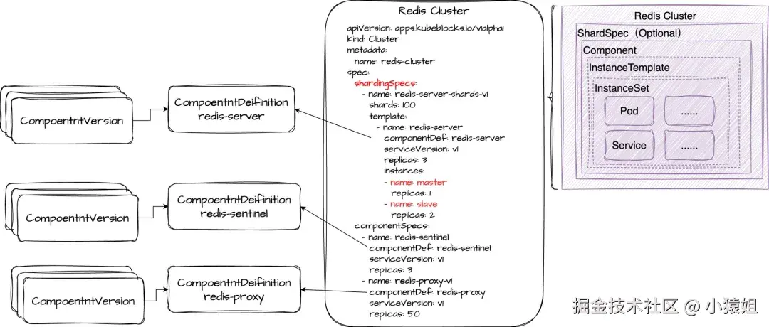 经过与 KubeBlocks 社区深度合作,我们通过如下方式实现一个 Redis 集群的编排: