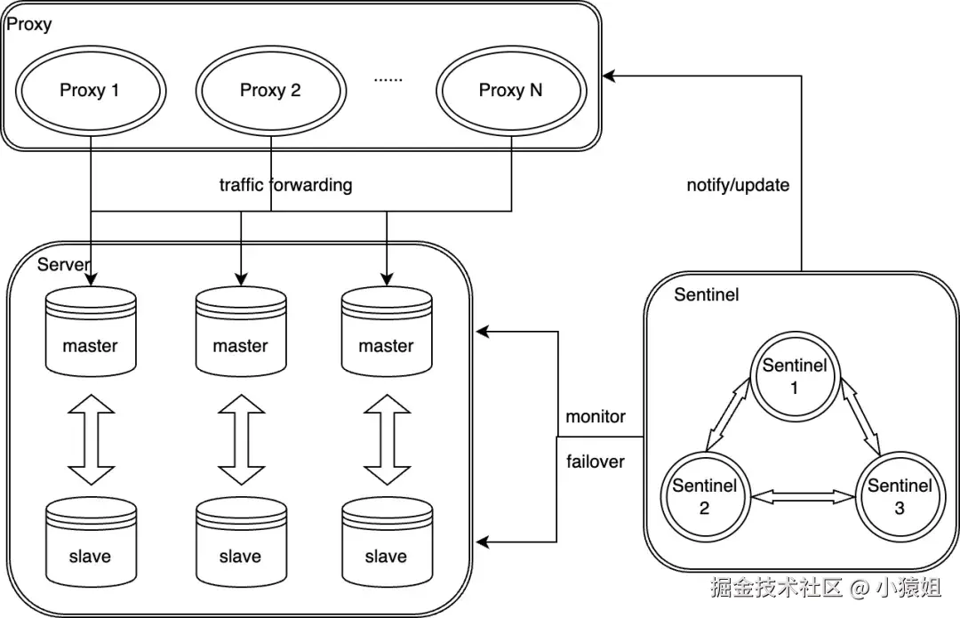 快手的 Redis 采用的是经典的主从架构,包含三个组件(Server、Sentinel 和 Proxy)。