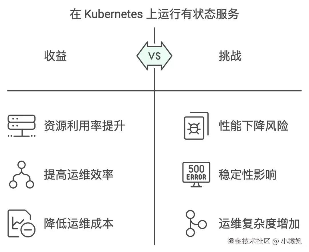 综上所述,有状态服务部署在 Kubernetes 上相比无状态业务来说需要更多风险考量,且实现的成本和难度相对较高。然而,这种投入往往是一次性的,而云原生化带来的收益则是持续性的,可以为企业未来发展提供坚实基础。因此,企业在决策时应充分权衡这些因素,以做出更具战略性的选择。
