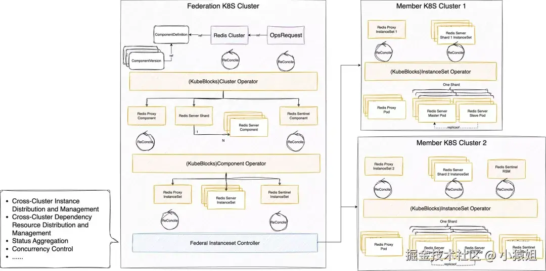 - 分层架构设计:基于不同 Workload 分别管理分片及其下的实例;具体而言,使用一个 StatefulSet 管理每个分片下的多个实例,并在此基础上构建一层新的工作负载,以实现对整个 Redis Server 集群中多个分片的统一管理;