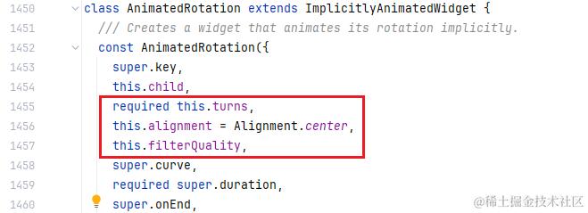 其中动画器 animation 是父类 ImplicitlyAnimatedWidgetState 暴露出来的,动画属性变化时会触发 didUpdateTweens 回调,更新过渡值。这就是 AnimatedRotation 的所有代码,是不是非常简单: