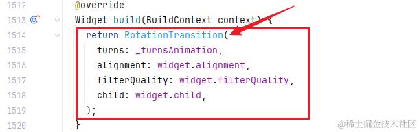 ImplicitlyAnimated 本质上是内部封装了动画控制器,将动画值暴露给子类。拿 AnimatedRotation 组件来说,在构建方面依赖 RotationTransition 组件: