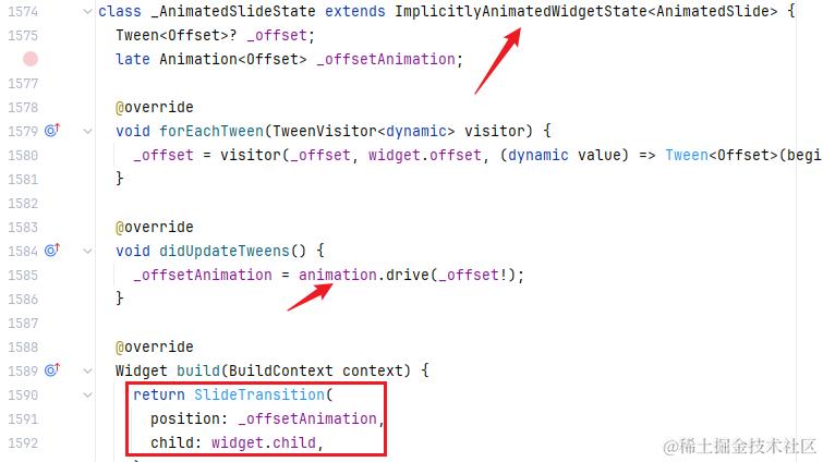 核心代码如下所示,在状态类中维护 Offset 对象,将其传入 AnimatedSlide 的构造函数中。拖拽进度条变化时,更新 offset 对象,重新构建 AnimatedSlide 组件。新旧值直接就可以动画过渡: