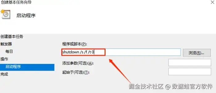 步骤3:在“操作”里选择“启动程序”,然后在输入框里输入“shutdown /s /f /t 0”,最后点击“完成”就设置好啦。