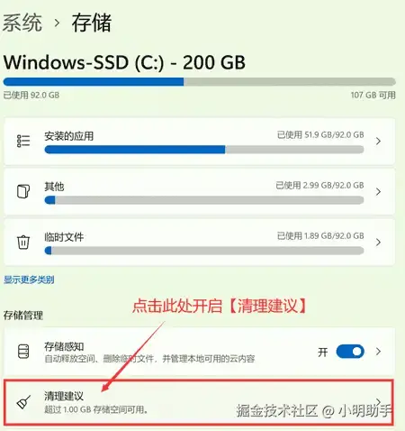 打开电脑的【设置】,然后找到【系统→存储】,点击【清理建议】,在里面有电脑已自行筛选出来的垃圾文件,用户可以根据自己的需求进行清理。