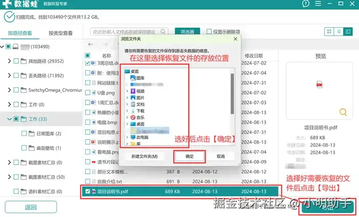 步骤2: 扫描结束后,在软件的右方选择自己需要恢复的文件,点击【导出】,最后选择好恢复文件的存放位置即可(只要不是丢失文件的原位置就行)。