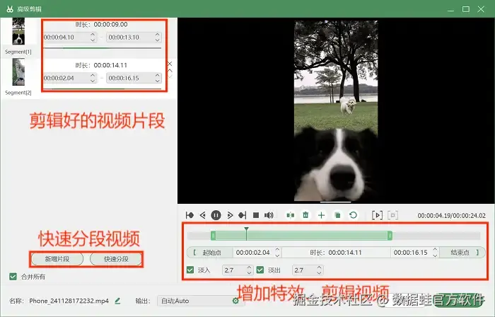 步骤4: 录制结束后,可以使用软件内置的后期编辑工具 “高级剪辑” ,对视频进行后期编辑操作,如快速分段视频、增加特效等。