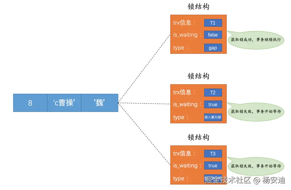 - 加锁成功:在内存中生成了对应的锁结构,而且锁结构的is_waiting是false,事务可以继续执行