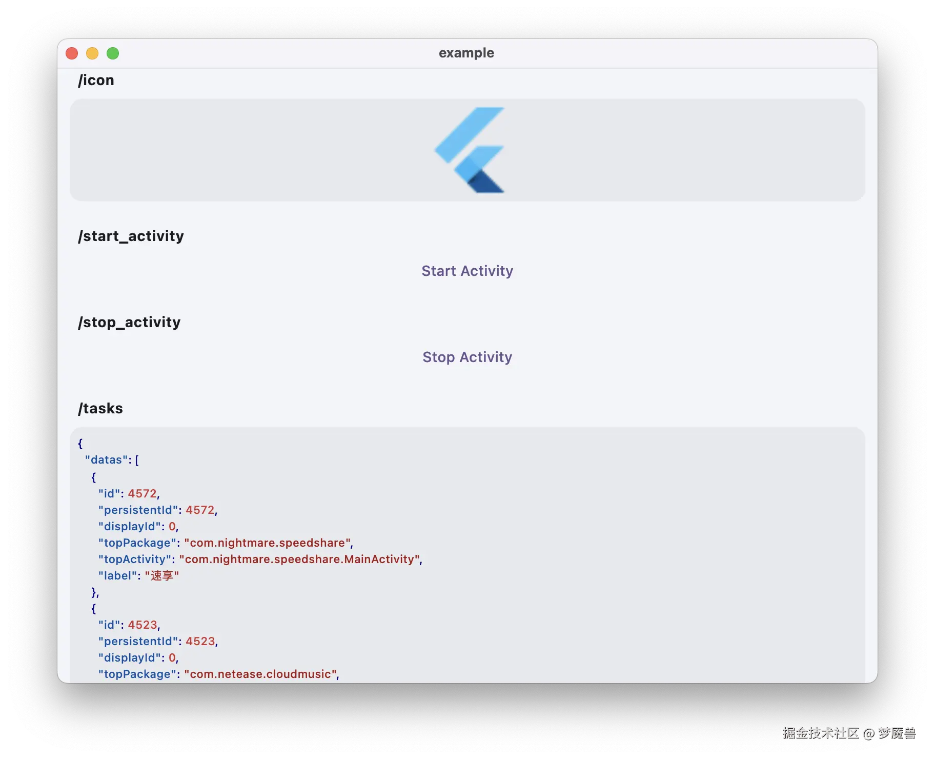 提供 android_api_server_client 来快速的让 Flutter App 拥有这个能力,无需手动启动服务,AAS 随 Flutter Plugin 注册而启动,直接创建 AASClient 则会使用 Flutter Plugin 中启动的端口